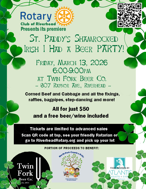 ![]() The Riverhead Rotary Club will host its Annual Pancake Breakfast on Sunday, Nov. 4, 2018 at Riverhead Polish Hall, 214 Marcy Avenue, Riverhead, from 8 a.m. to 12 noon. Breakfast of pancakes — choice of chocolate chip, blueberry or plain — sausage, apple wood-smoked bacon, eggs, bagels, coffee and juice. Clown, face-painting and balloons for the kids. 50-50 drawing and raffle. Tickets are $15 for adults, $12 for seniors, and $8 for kids. (Kids under 3 are free). Tickets are available at the door or in advance from any Riverhead Rotarian. This fundraiser helps Riverhead Rotary support scholarships and many worthwhile community charities in Riverhead and beyond. |